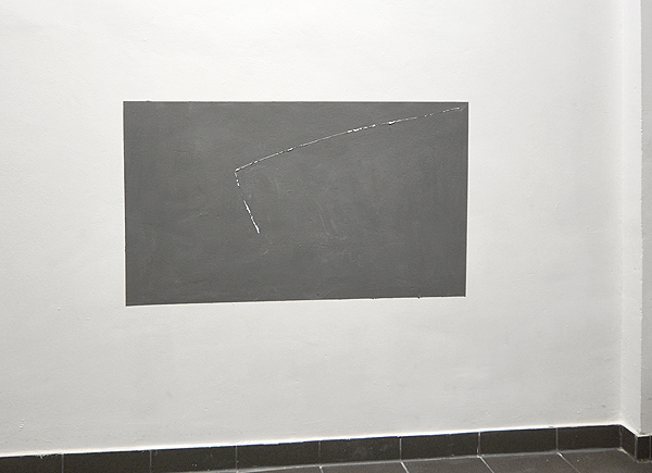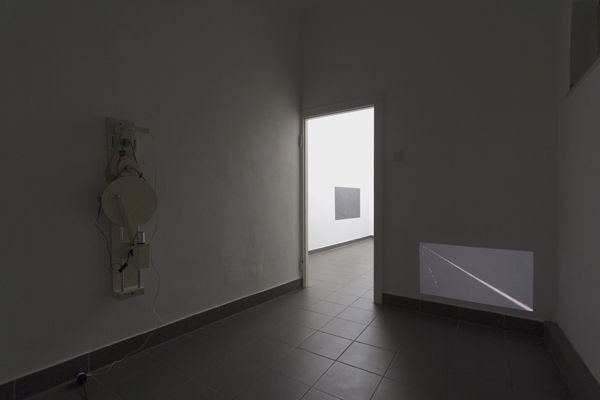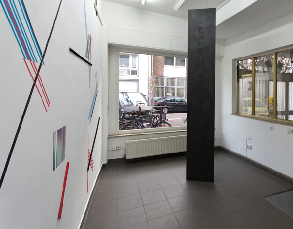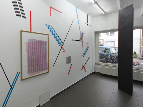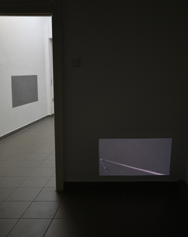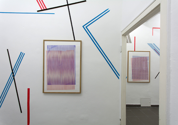 Additional to their collaborative works Maitre and Danish have each placed one of their personal works that relates to their common interest. A carpet hung on the wall and a multi-colored rope demonstrate the use of accidental and ephemeral compositions. The carpet shows a trace made by stroking with the hand against the grain of the carpet fibers. The rope randomly thrown on the floor creates a momentary color composition.