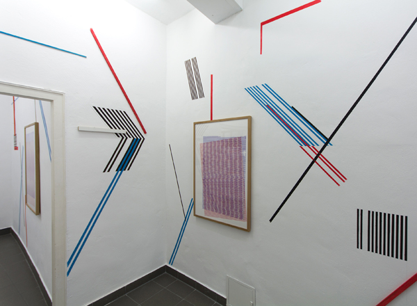 Thus, the everyday and often fleeting perception is increased and the history of a space with its scratches, stains and imperfections becomes more visible and experienceable. With smaller settlements and fractions she manages to avoid a too formalistic or straight-line method and to reduce the hierarchies within the space in a playful ease. It remains up to the viewer to interpret Nadjis installation in an analytical way or through association, also if it affects the own perception. If you like the poetic way of reading, you could read a color field on the wall as a virtual window to the outside, with a wide view over the sea, a curtains blows gently in the wind. Elsewhere, the radiator becomes a pedestal and a carpet bulges out of a small row of windows.