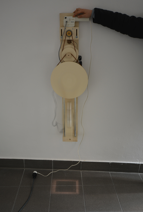 Dementsprechend entpuppt sich die Mechanik in einem transparente Kasten neben einer flackernden Leuchtstoffröhre als großer analoger Zufallsgenerator. Das als 'Schalter' fungierende triple-pendulum stammt aus der Chaostheorie. Es zeigt bei jeder Bewegung aus einem stets identischen Anfangszustand ein jeweils anderes chaotisches bzw. individuelles Verhalten. Übertragen: wieso kommen Menschen, die der gleichen Faktenlage ausgesetzt sind zu divergierenden Überzeugungen und daraus resultierenden Verhaltensweisen?